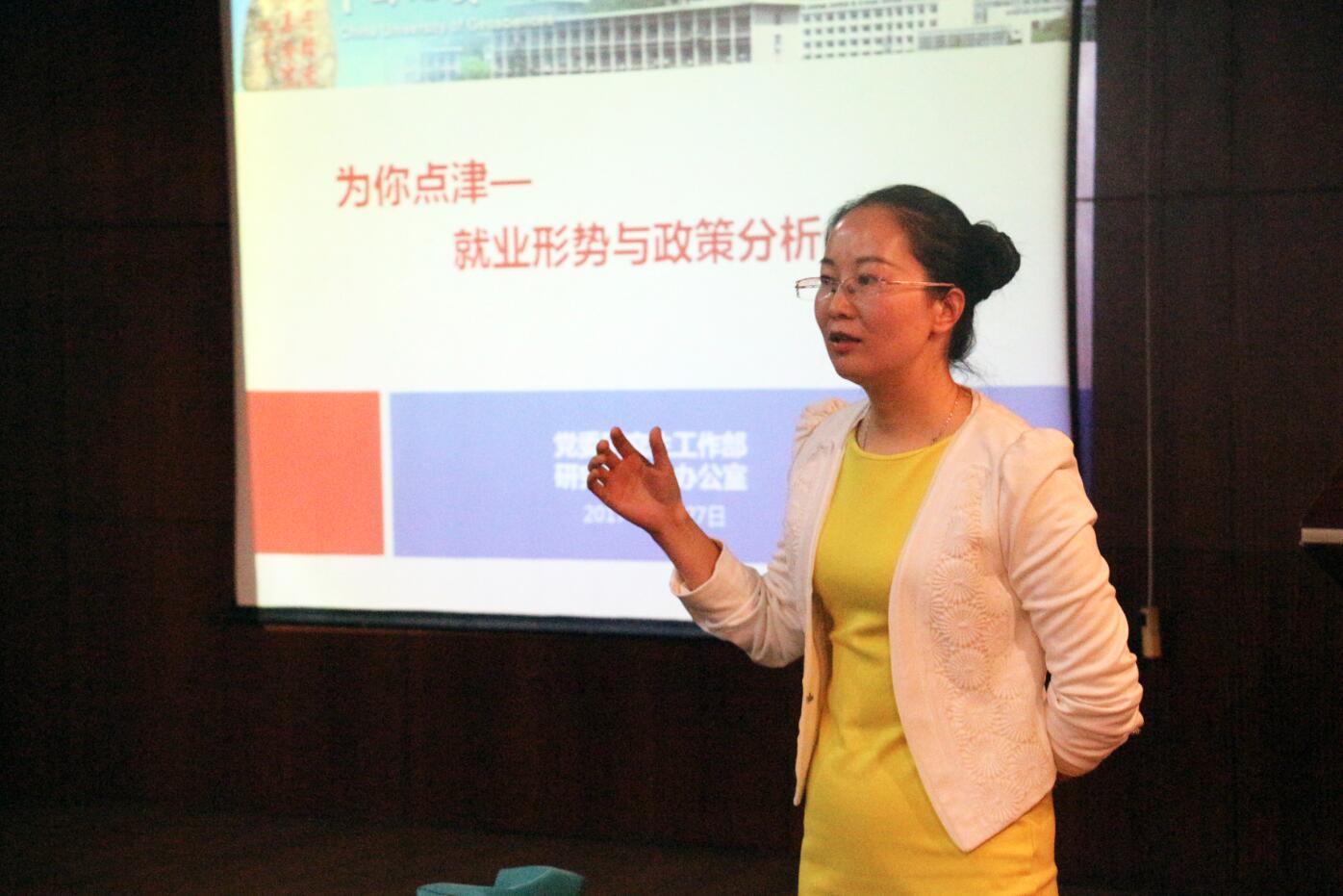 陈慧副部长从毕业生就业形势、毕业前准备、就业政策解读及就业指导资源的获取等四个方面为毕业生同学进行了讲解和指导。她分析了我校研究生就业的基本情况以及近年来就业市场的变化,解读了中央、地方以及学校各项就业、创业政策,尤其对理工科女生的就业情况进行了具体而又细致地分析,并针对女生就业难的问题提出了几点建议。随后,陈慧副部长就生源信息核对、协议书签订、户口迁移等事项进行说明,提醒毕业生同学尽早准备相关材料,并建议同学们积极了解企业招聘特点,提高就业竞争力。她希望毕业生们摆正就业心态,合理安排求职时间,全面地了解和认识自己,转变就业观念,树立正确的择业观,尤其要关注重要领域、重点行业。