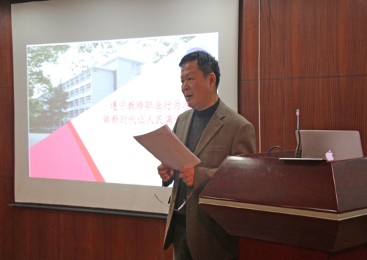 党委书记刘子忠在全院教职工大会上领学教育部《新时代高校教师职业行为十项准则》和《关于高校教师师德失范行为处理的指导意见》。