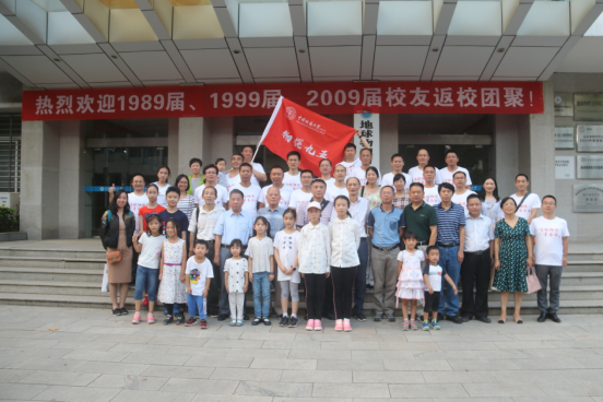 会后,参会师生物探楼前合影留念。随行的家属团与返校校友规模相当,是校友们的坚强后盾,祝福校友们事业生活更加美好。