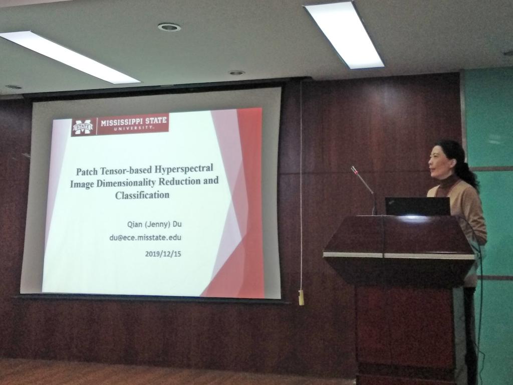 ,并在物探楼222学术报告厅做了“Patch Tensor-based Hyperspectral Image Dimensionality Reduction and Classification”的学术报告,全校40多位师生到场聆听讲座。