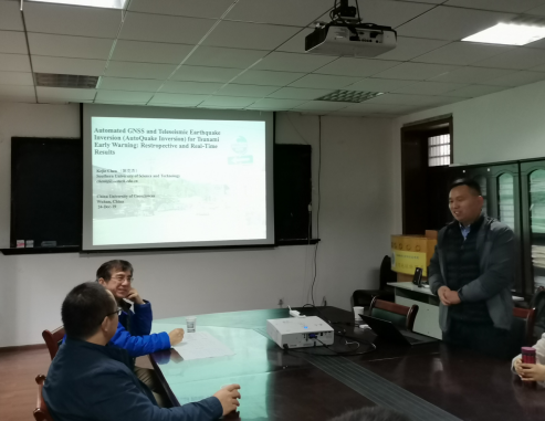 ,并在物探楼214学术报告厅做了“Automated GNSS and Teleseismic Earthquake Inversion (AutoQuake Inversion) for Tsunami Early Warning: Retrospective and Real-Time Results”的学术报告,全校多位师生到场聆听讲座。
