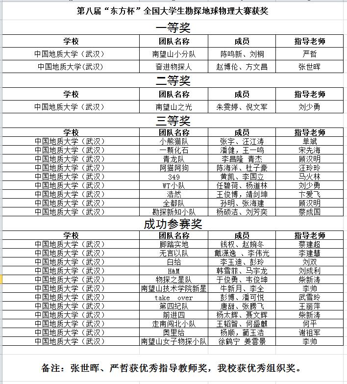 共有研究生和本科生组成的24支团队报名参赛,3支学生团队成功晋级决赛并获奖。由卞爱飞老师领队,南望山小分队(成员:陈鸣新、刘桐)与奋进物探人(成员:赵博伦、方文昌)两支团队荣获大赛一等奖,南望山之光团队(成员:朱雯婷、倪文军)荣获大赛二等奖,张世晖、严哲两位教师荣获“优秀指导教师”奖。