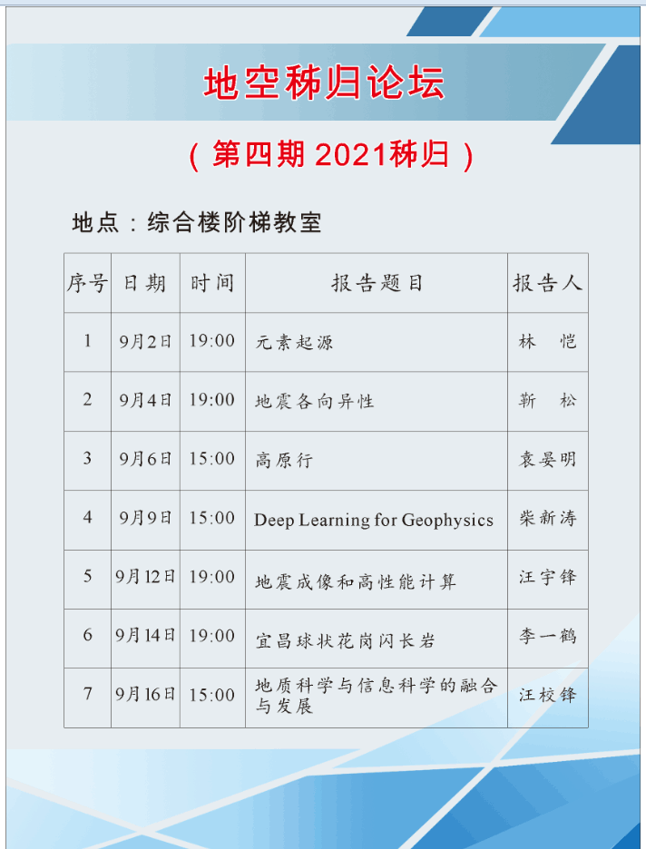 此次实习期间,实习队继续设置了第四期地空秭归论坛活动。参加此次带班实习的各位教师将为同学们呈现行星科学、地质野外生存、地球物理、地球信息技术等方面的精彩学术前沿。