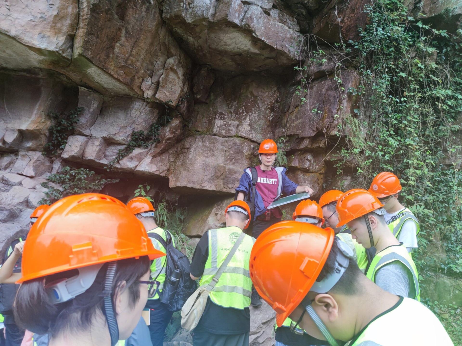 孙杨轶和李一鹤老师带领学生在青林口对比观察莲沱组和南沱组岩石标本