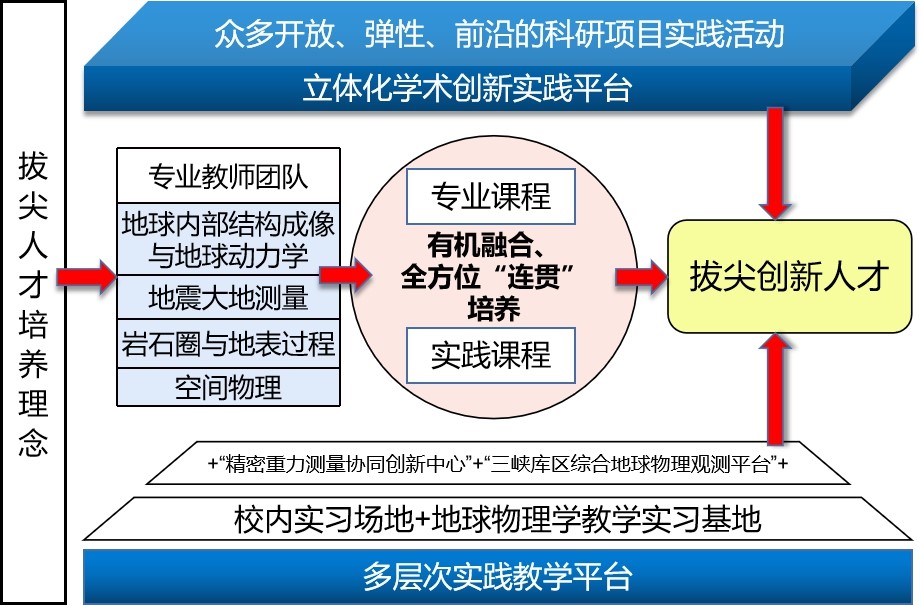 学院抓住地球物理学拔尖人才培养难点和薄弱环节,以实践教学基地建设、专业课程改革、实践平台内涵创新为突破口,将实践教学融入专业人才培养全过程建设多层次、全方位、立体化的实践教学平台,支撑国家一流学科拔尖人才培养:一是重点改革地球物理学北戴河教学实习,打造新的软硬件兼备的多层次实践教学平台;二是优化调整专业课程体系,突出和强化实践教学环节,形成课堂教学和实践教学的有效融合,全方位连贯培养学生实践创新能力;三是立足教学团队学科专业优势,通过构建开放弹性的实践训练模式,构建立体化学术创新实践平台,扶助学生尽快适应和融入专业学习,实现在科教融合中培养高质量创新人才的目标(见图2)。
