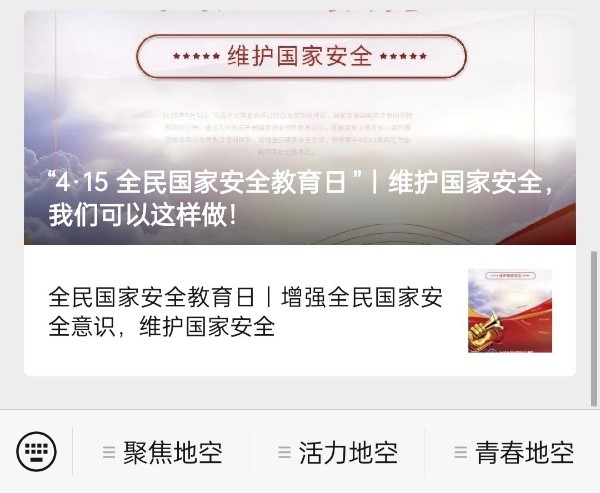 学院微信公众号发布《“4·15 全民国家安全教育日”|维护国家安全,我们可以这样做!》《全民国家安全教育日|增强全民国家安全意识,维护国家安全》专题推文,广泛宣传全民国家安全教育日,动员师生参与网络安全大赛(CTF竞赛)线上答题活动。同时,学院张贴国家安全教育日系列海报,集中展示全民国家安全教育日内容。