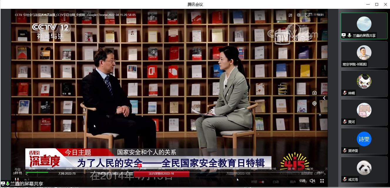 学院在物探楼214组织师生收看《“千万师生同上一堂国家安全教育课”主题公开课》《为了人民的安全——全民国家安全教育日特辑》专题视频,班级学生干部通过腾讯会议一同参与。学院学生党支部利用线上线下结合方式,收看《高校国家安全教育教学风采展示活动》系列学习视频。