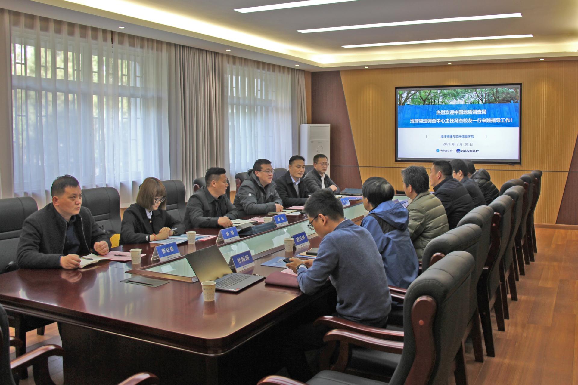 开展校企合作洽谈。中国地质调查局地球物理调查中心主任、党委副书记冯杰,副主任、总工程师郭鹏,副主任陈山,科学技术室主任王斌,人事教育室刘璐、襄阳基地主任张红伟,学院党委书记马彦周,副书记黄金波,副院长蔡红柱、严哲,学院教师代表顾汉明教授及毕业班辅导员祁阳阳参加洽谈会。会议由黄金波主持。