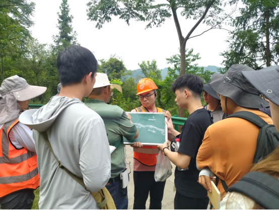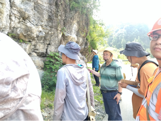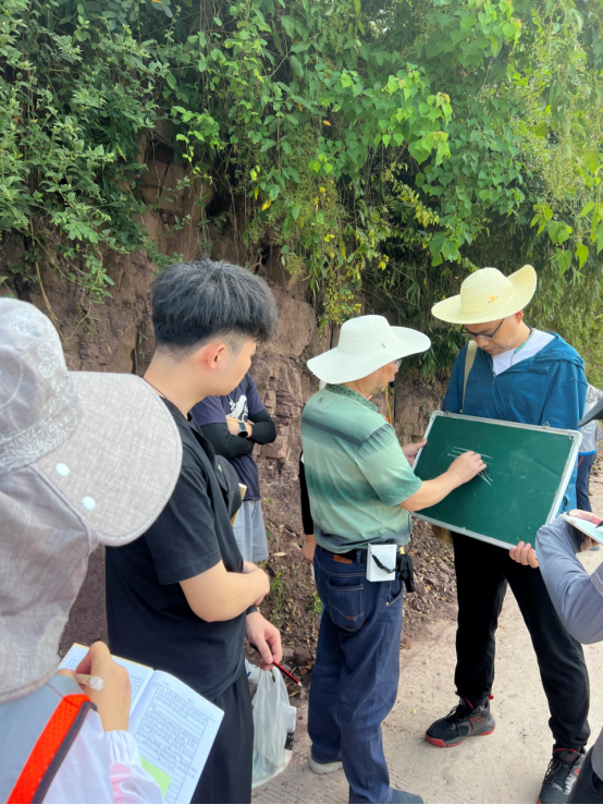 明年即将荣退的资深教授袁晏明老师坚持站好最后一班岗,期望尽其所能为学院培养出更多质量优秀的青年地质教师。秭归37°的高温天气,阻挡不住袁老师的教学热情,他在石板溪旁的小房子后侃侃而谈,讲述着晋宁运动、8.2亿年前的黄陵花岗岩及7.5亿年前的莲沱组砂岩相关教学内容,无论是已来过多次的教师,还是新来的教师,都认真聆听并做记录,不放过任何一个向袁老师学习的机会。