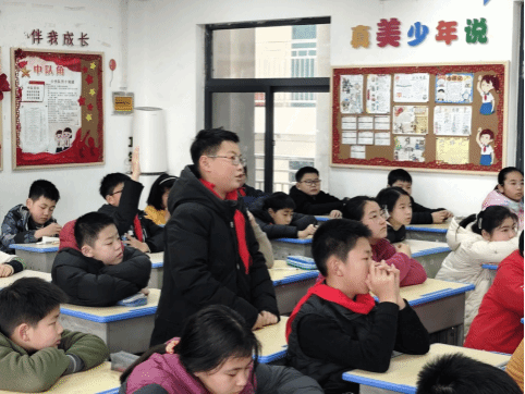 4名宣讲团成员与五年级一班全体同学合影留念