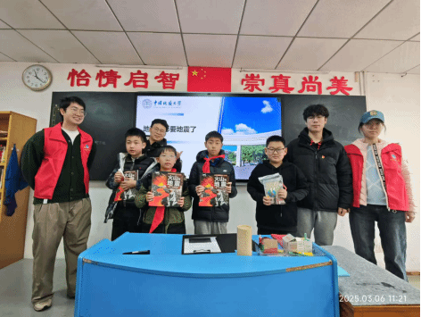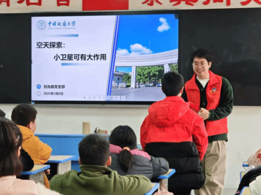 刘光鼎党支部星空筑梦科学家精神宣讲团走进地大附小五年级一班,以"探索地球奥秘·解码卫星科技"为主题,通过沉浸式科普讲座,在青少年心中播撒下科学的种子。宣讲团成员黄润林、胡林兵、张志轩、陈宇硕参与了此次科普活动。