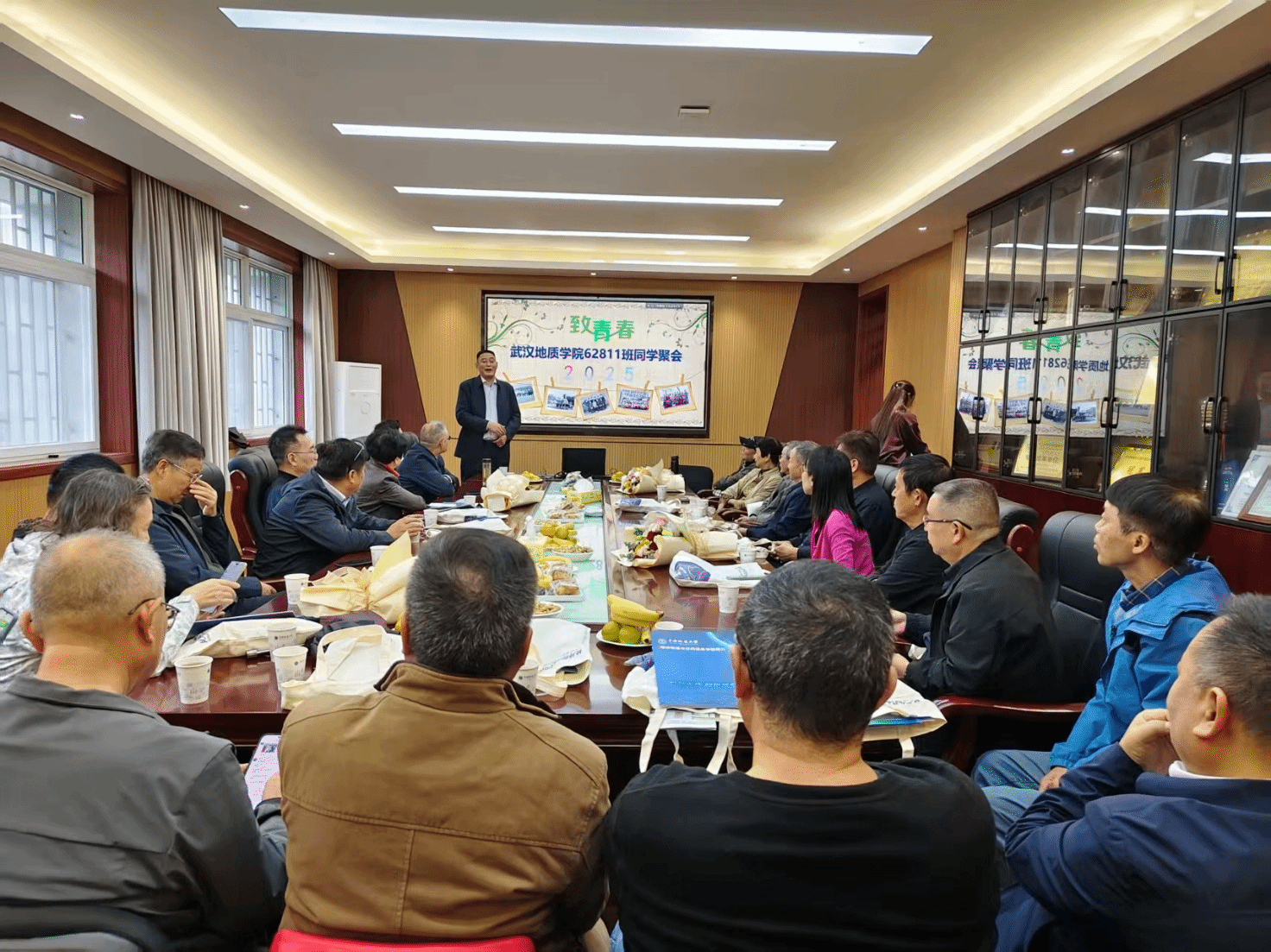 班会上,校友轮番忆旧。恩师教诲、宿舍趣事,四十年的奋斗路——从戈壁到海洋勘探,从探井攻关到水利工程,他们在各自的人生舞台上闪闪发光,为62811班书写荣光,为学院增添光彩。青丝虽霜,家国理想仍燃,同窗情谊更醇。