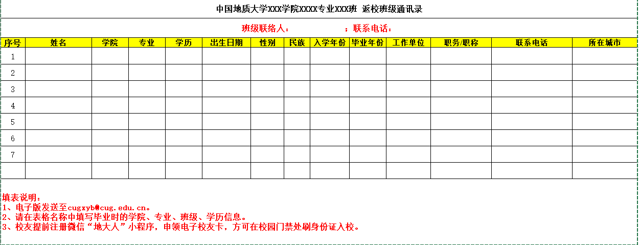 以班级为单位返校的校友,可填写《返校班级通讯录》,经学院确认后发至校友处邮箱[email protected],或联系校友服务办公室027-67883684,校友处会为每位返校校友准备爱校纪念包。